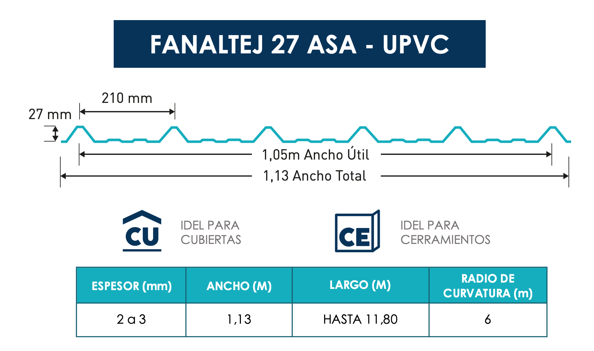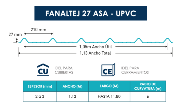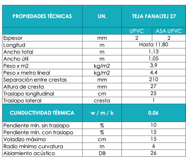 Las cubiertas FANALTEJ están fabricadas con tecnología en UPVC y núcleo de PVC espumado, lo que garantiza una alta resistencia, excelente aislamiento térmico y acústico, y gran durabilidad frente a condiciones climáticas extremas y agentes químicos. Son ideales para todo tipo de proyectos industriales, comerciales y residenciales.